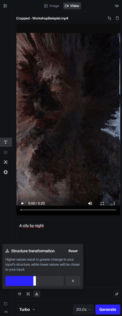 Je höher der Wert der Strukturtransformation ist, desto mehr Freiheiten nimmt sich das Modell bei der Neuinterpretation des Originalvideos. Wenn die Struktur klar erkennbar sein soll, ist der Wert „3“ eine gute Basis. Aber wie immer gilt: Herumspielen ist ausdrücklich erwünscht! 🙂 Die maximale Länge des Videos darf 20 Sekunden betragen.