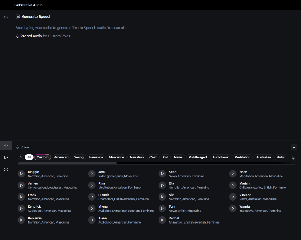 Hier wird eine große Auswahl an Stimmen angeboten. Wichtig zu wissen ist, dass das KI-Modell die Sprache im Eingabefeld erkennt und dann, obwohl die Beispiele in Englisch sind, auch deutsche Texte problemlos wiedergibt. Es ist auch möglich, die eigene Stimme aufzunehmen, um mehr Kontrolle über die Betonung des Textes zu haben.